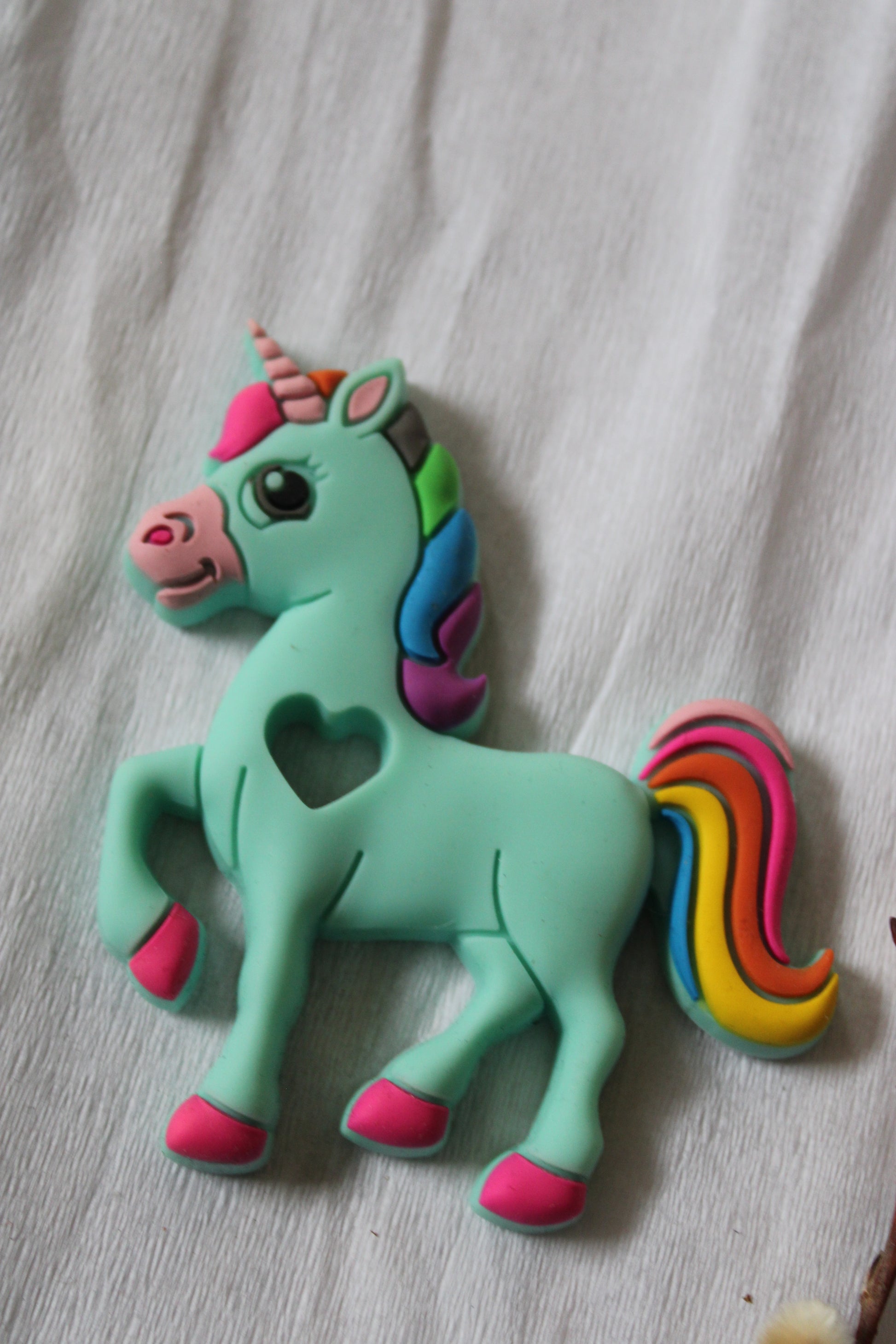 Grøn enhjørning bidering. Kan bruges til f.eks. rangler, suttesnore og uroer.