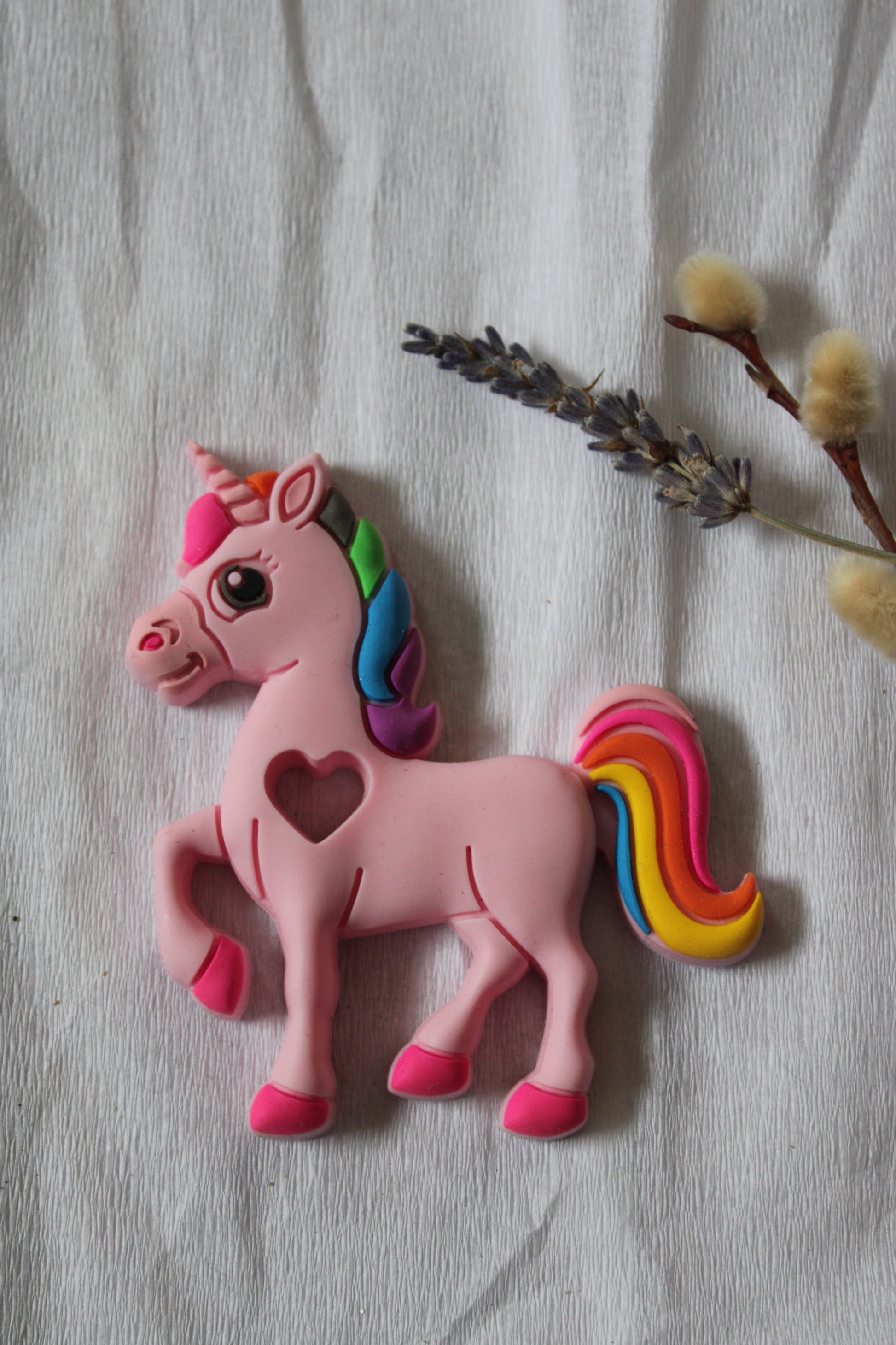 Pink/lyserød enhjørning bidering. Kan bruges til f.eks. suttesnore, rangler eller uroer.