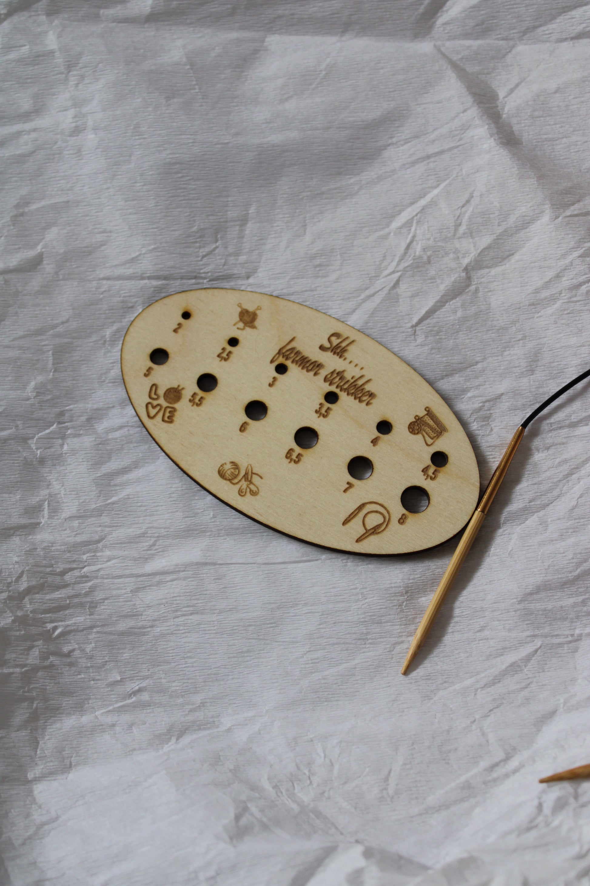 En personlig strikkepindemåler, der måler 12x7 cm. Lavet i træ.