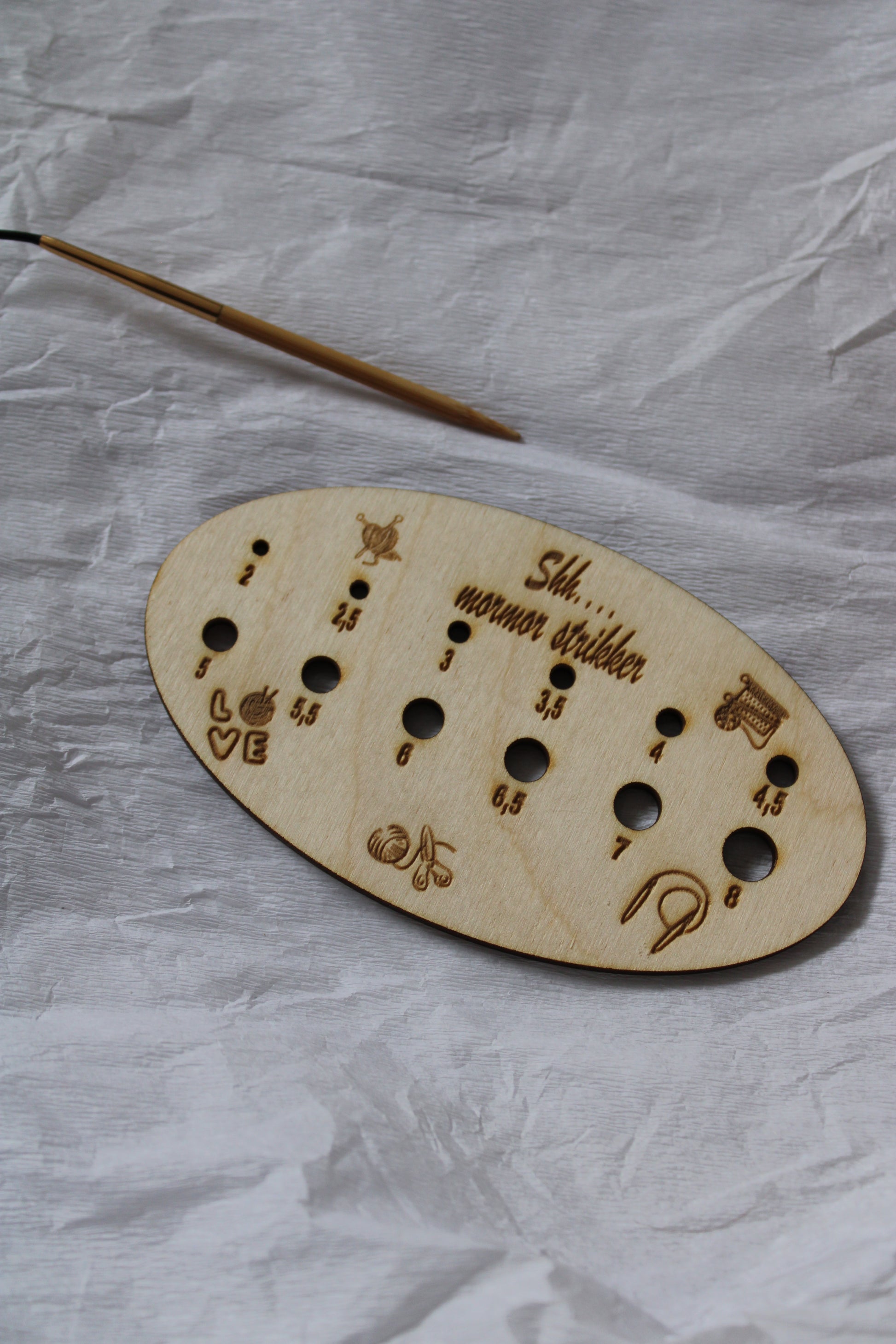 En personlig strikkepindemåler, der måler 12x7 cm. Lavet i træ.