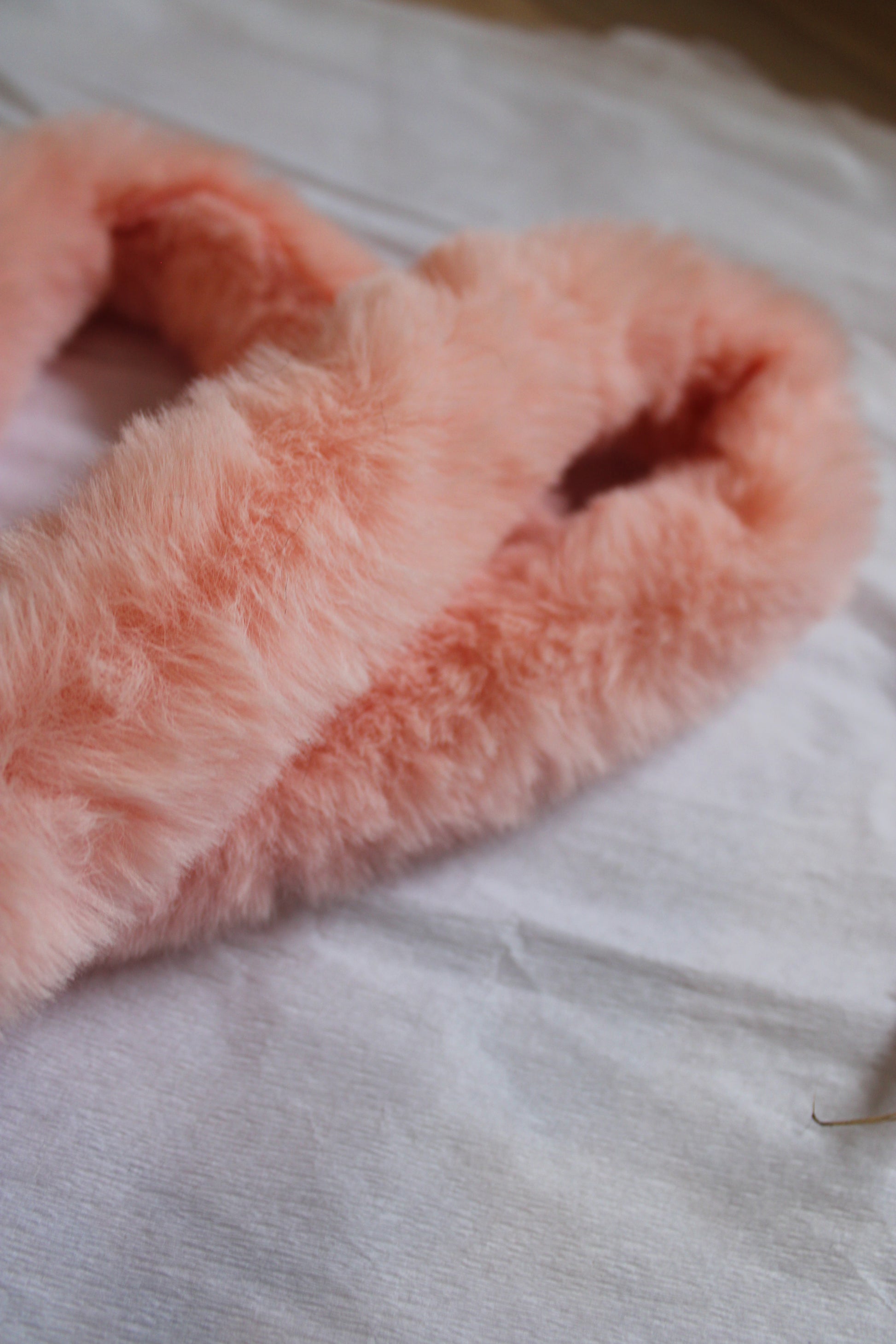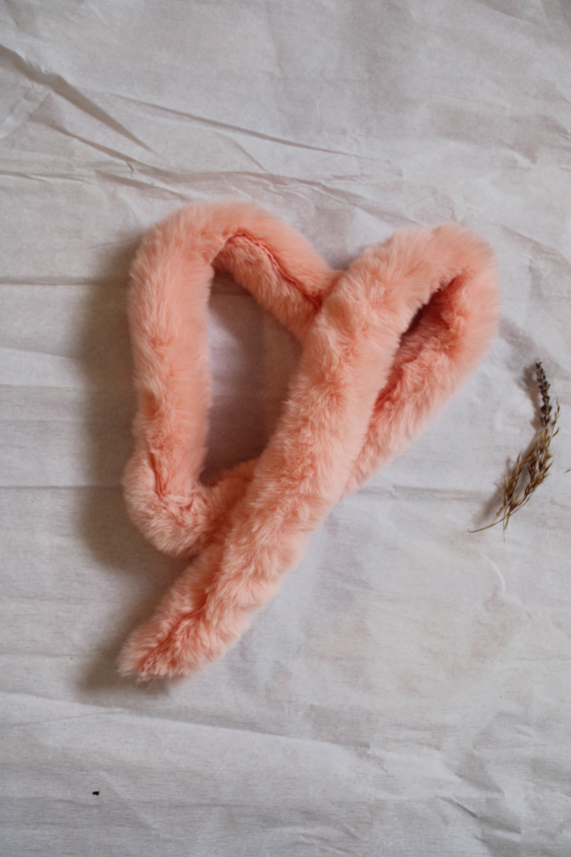 Lyserød pelskant i fake fur, der måler 95 cm pr. stk.
