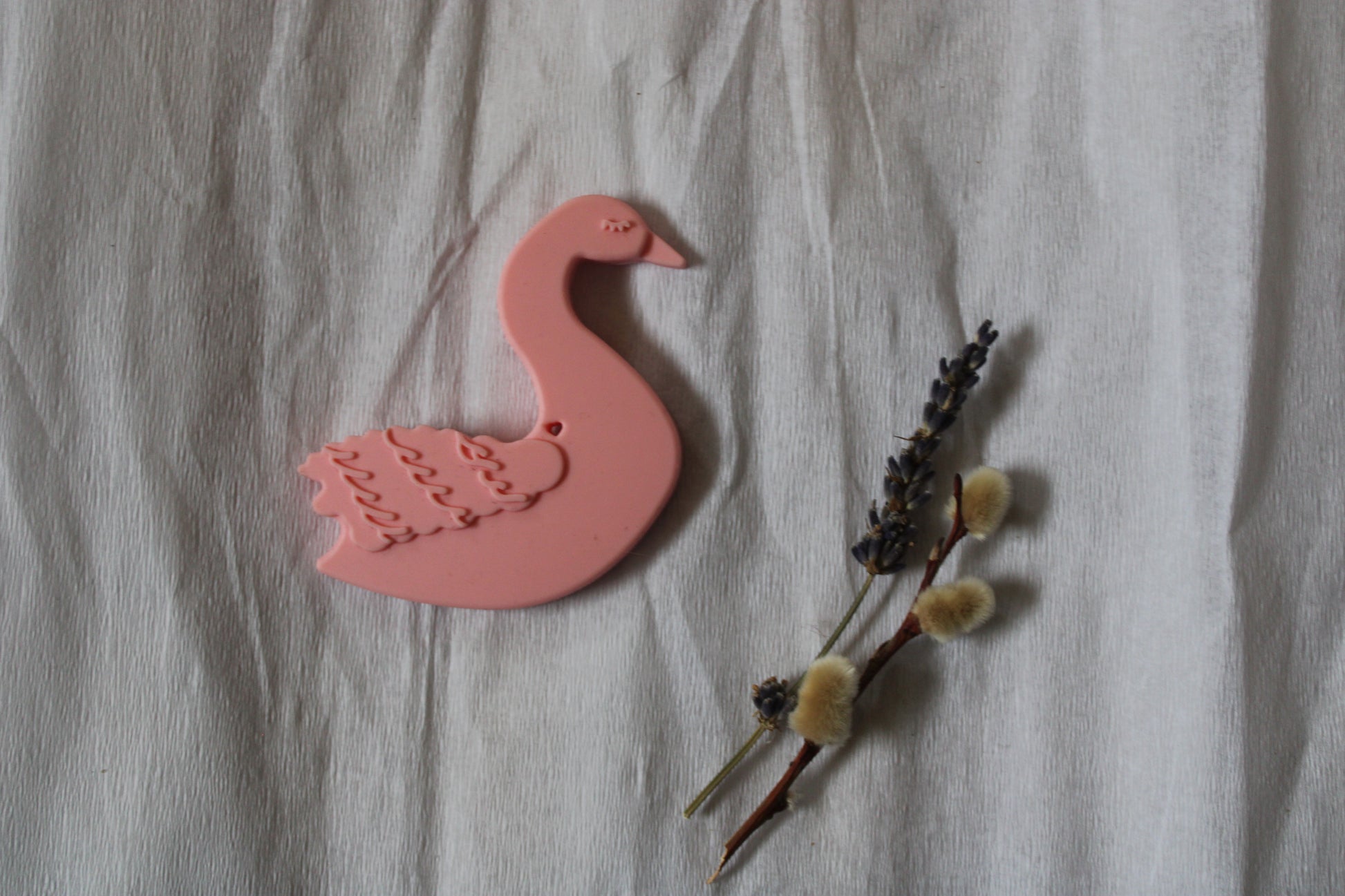 Svane bidering i lyserød silikone. Kan f.eks. bruges til rangler, uroer, bideringe og lignende.